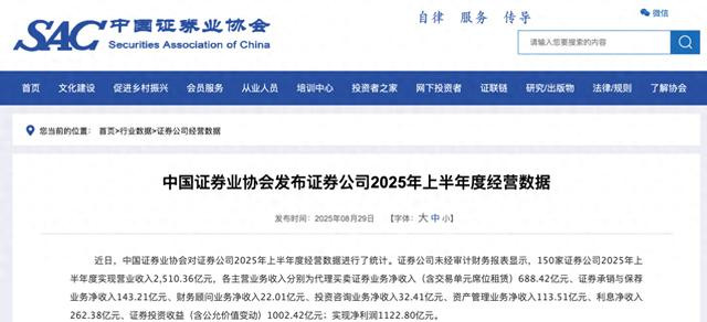 [环球网财经综合报道]日前,中国证券业协会对证券公司2025年上半年度的经营数据进行统计,依据券商未经审计的财务报表,150家券商在2025年上半年实现营业收入2510.36亿元。